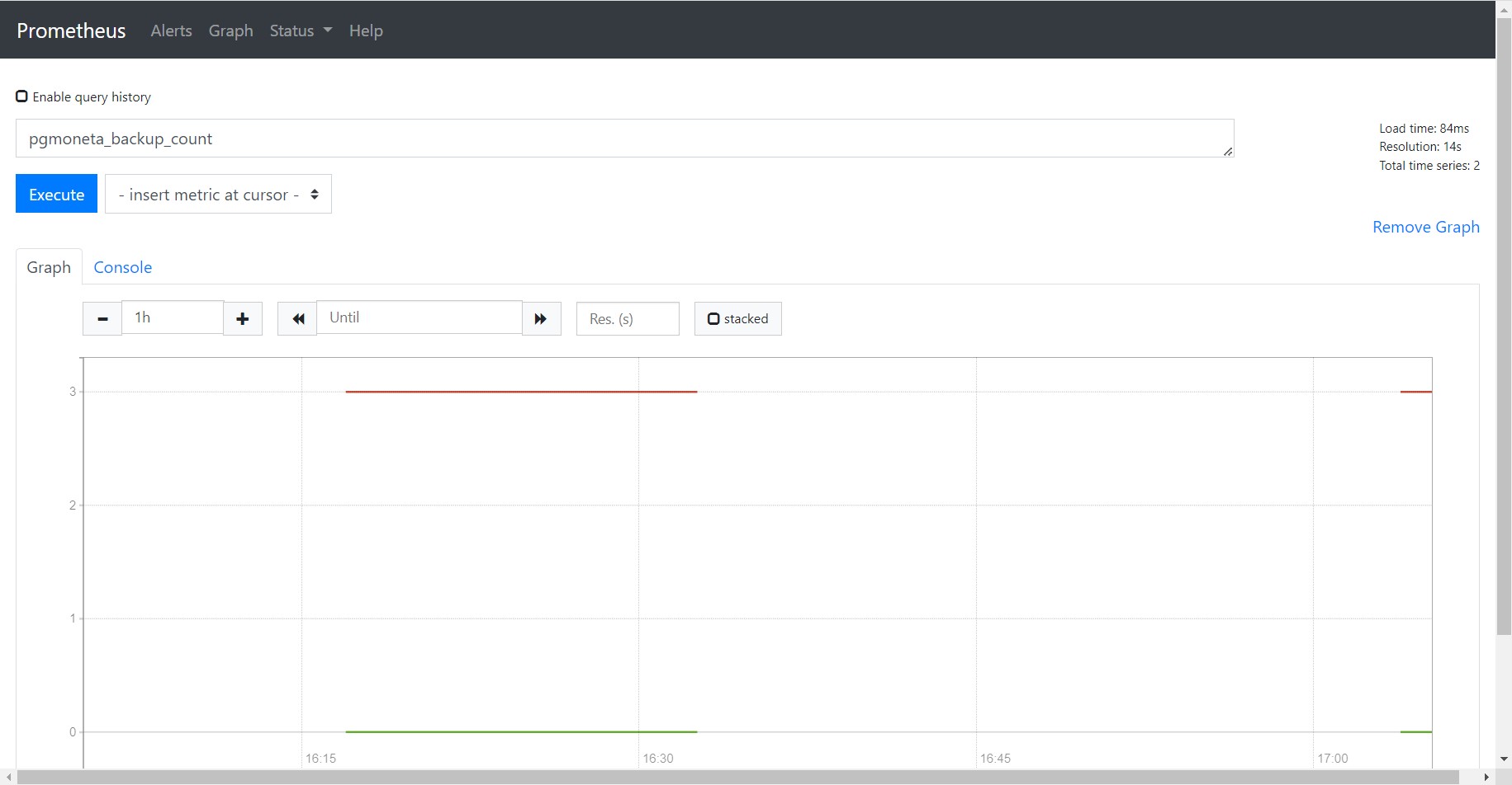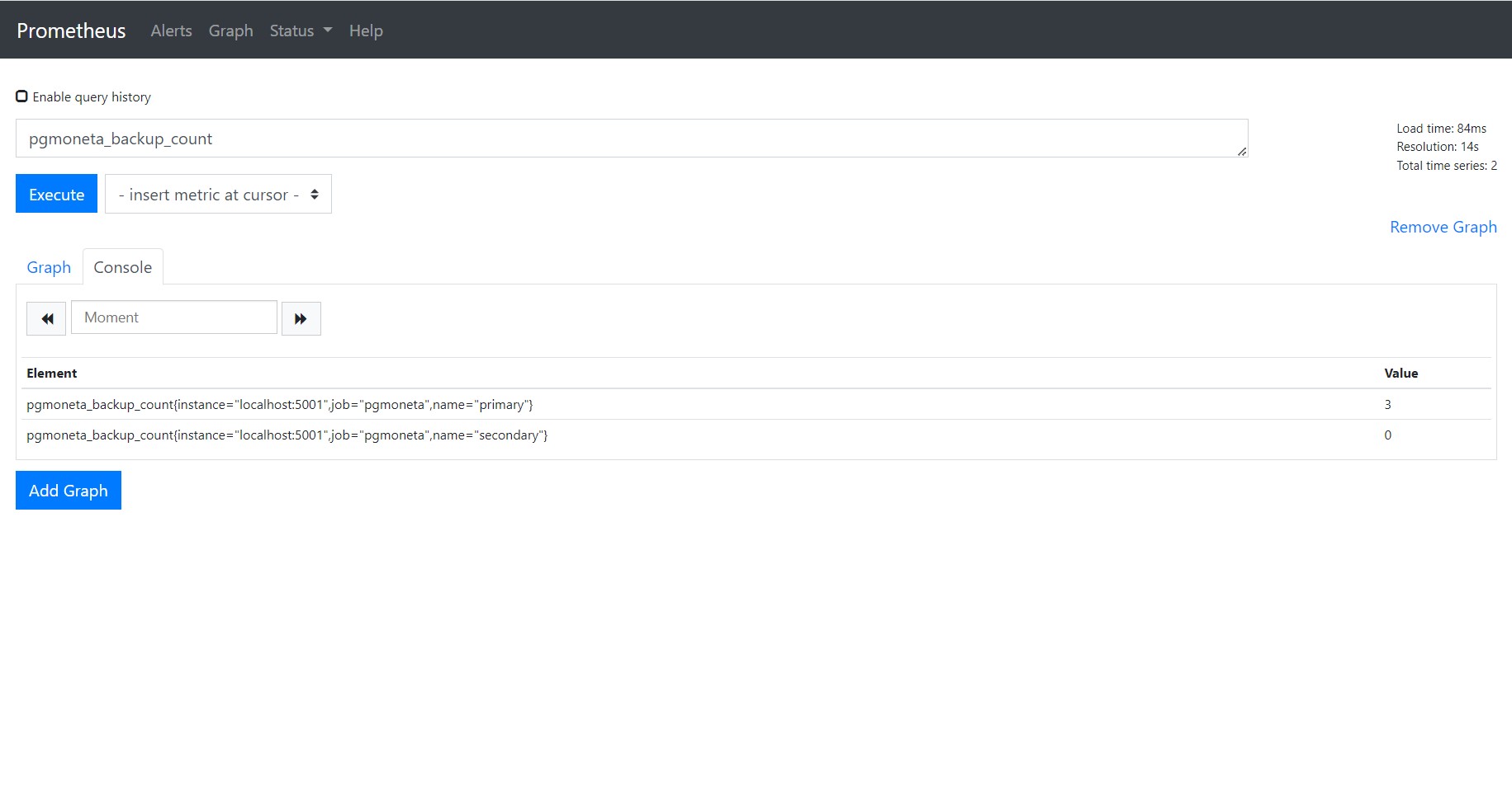 Then the Prometheus service will query your [pgmoneta][pgmoneta] metrics every 15 seconds and package them as time-series data. You can query your [pgmoneta][pgmoneta] metrics and watch their changes as time passed in Prometheus web page (default port is 9090).